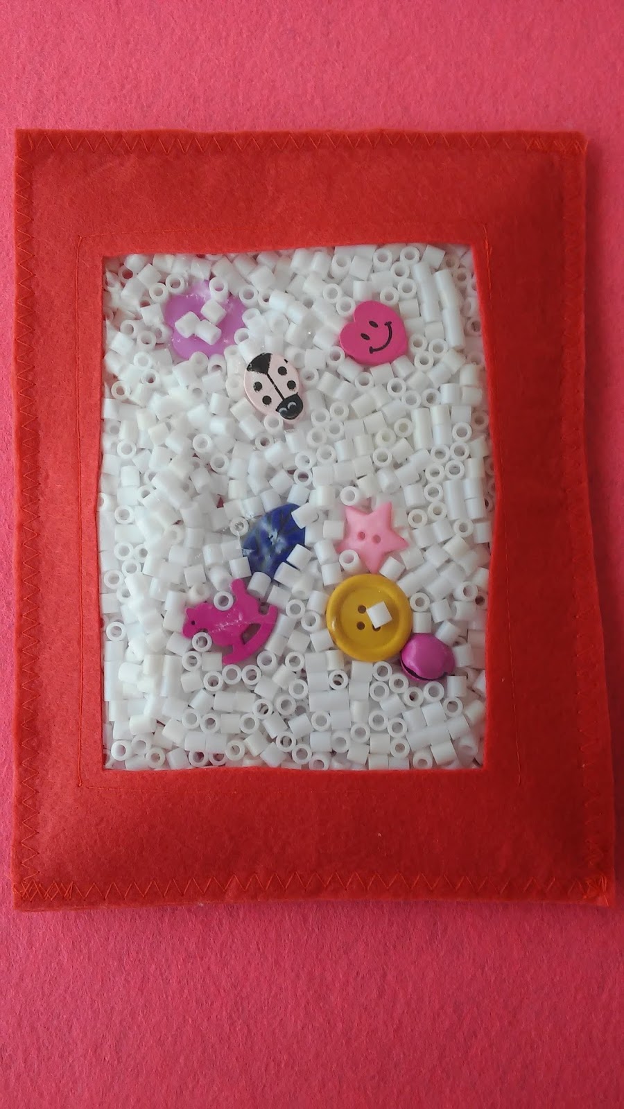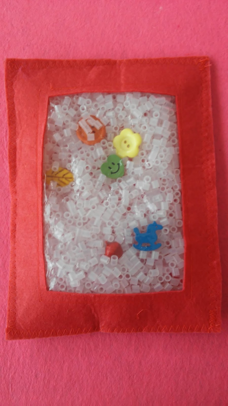 Los materiales como veis son fieltro, objetos que queramos y como no bolitas blancas para camuflar los objetos y plástico para que haga de ventana, luego a coser y ya está lista nuestra bolsa.
