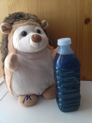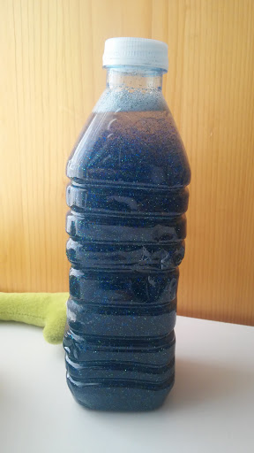Esta botella que tiene purpurina de colores ( en mi caso yo la hice con azul y verde) o bien se pueden añadir pequeños objetos, que al agitarlos se mueven muy rápido y cuando la dejamos quieta esta se va moviendo lentamente hacia abajo hasta quedarse quieto.