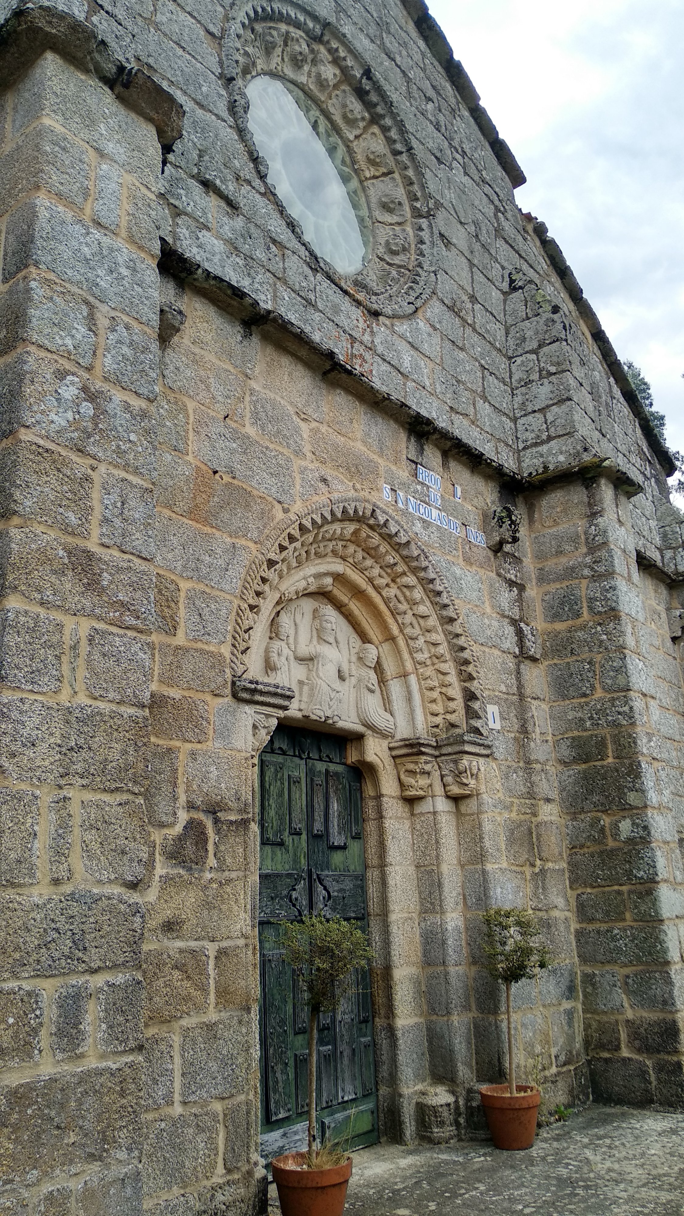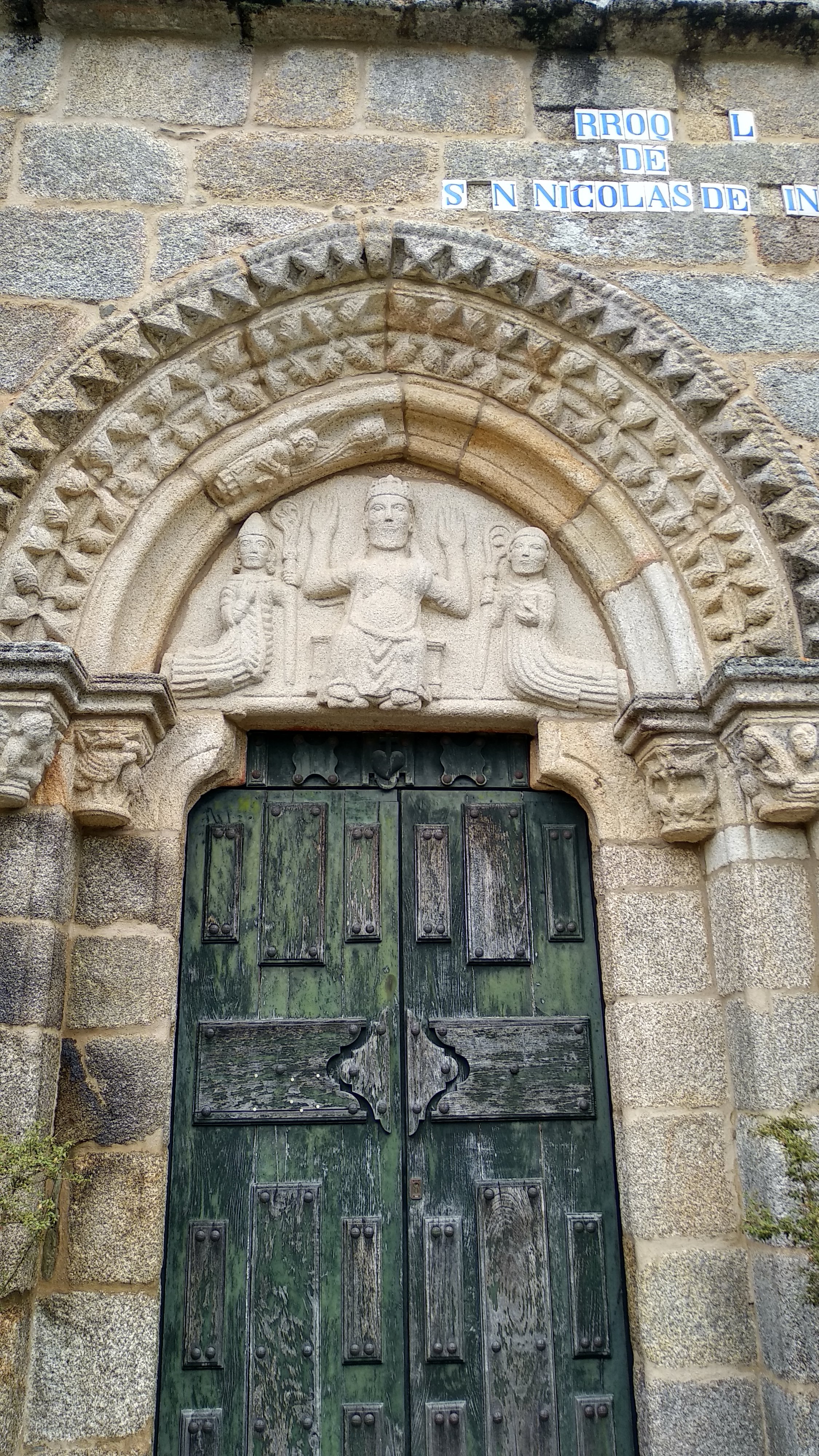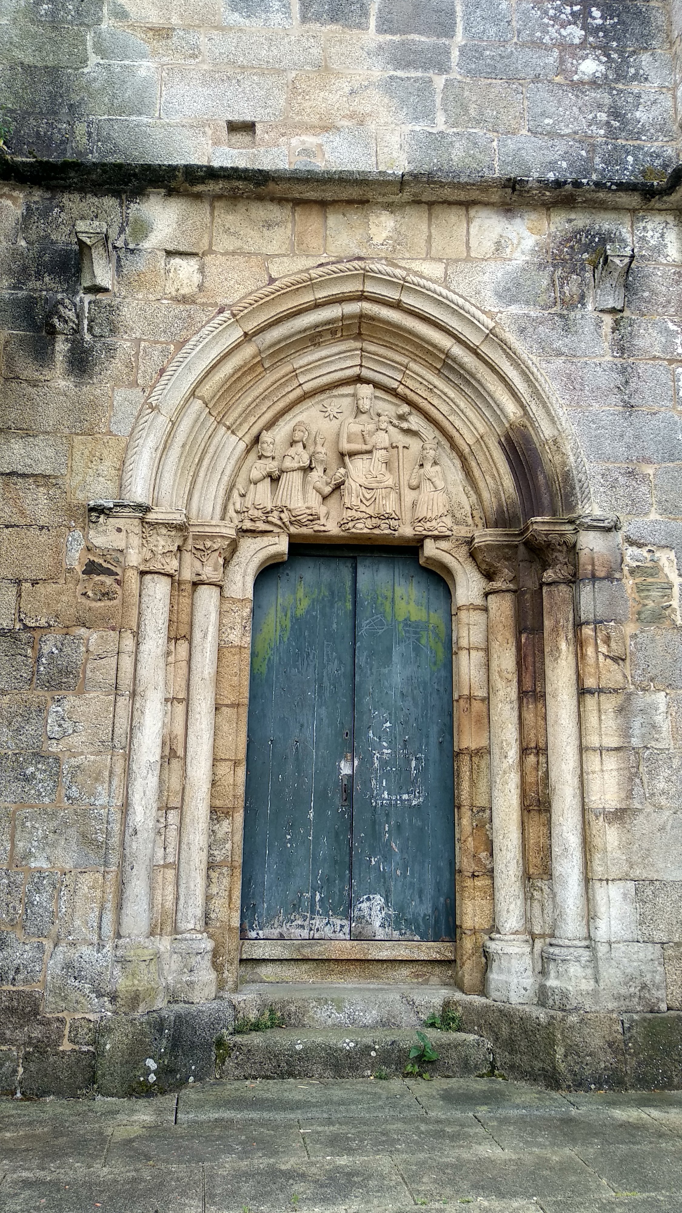 Culminando la fachada hay un hastial sobre el que está colocado una antefija con forma de jabalí con cruz florenzada ( el jabalí es la marca personal que Fernán Pérez de Andrade “O Boo” dejaba sobre las iglesias que promovía).