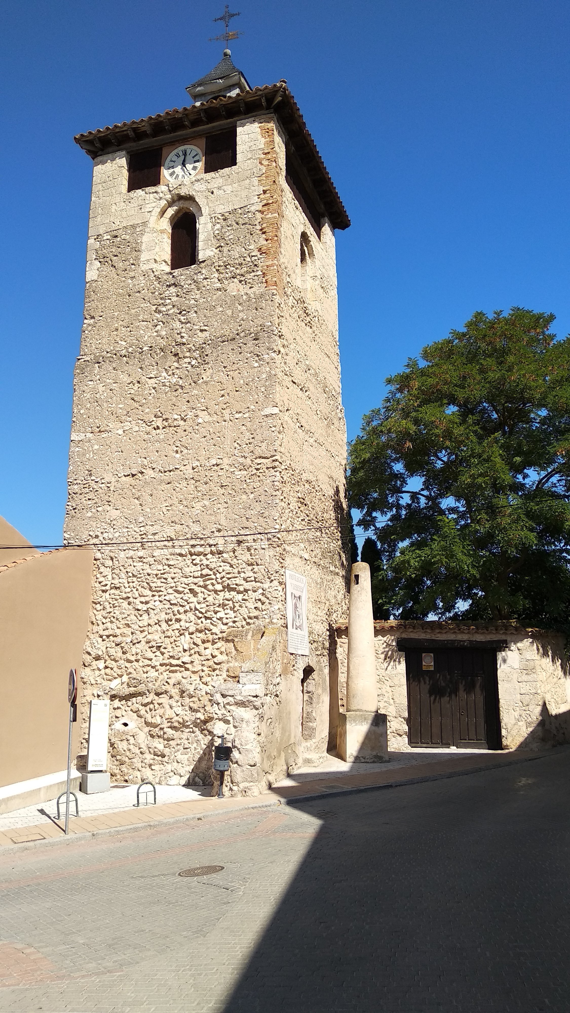 Esta torre gótica es lo que queda de la iglesia de San Esteban, construida en 1086, el reloj fue puesto por el Consejo de Peñafiel en el siglo XIX y de ahí se pasó a llamar asi, este edificio muestra una doble funcionalidad defensiva y la de alojar las campanas de llamada a los fieles de este barrio ( este barrio es uno de los primeros de Peñafiel), de la iglesia solo quedan algunos muros y contrafuertes que están fijados a la Torre.