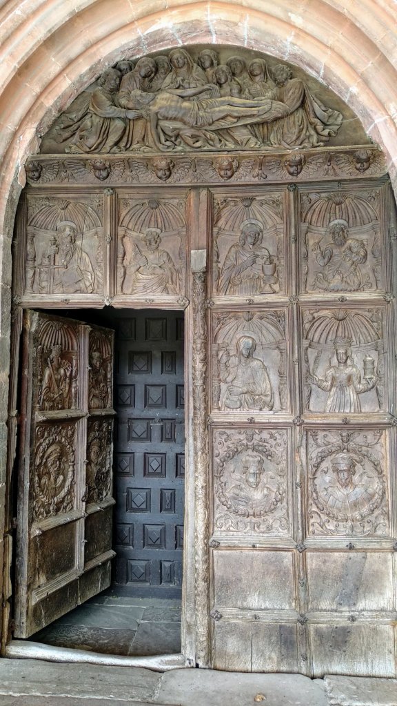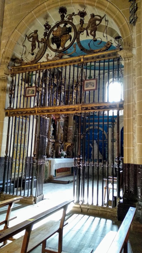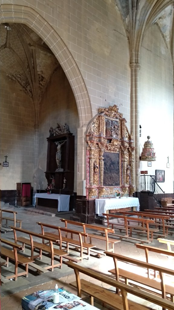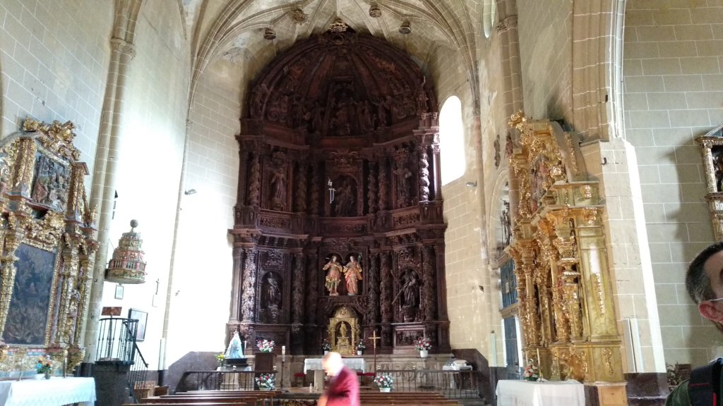 La Puerta de entrada es de estilo Plateresco con bajorrelieves, el retablo mayor Barroco de Nogal está fechado en 1696.