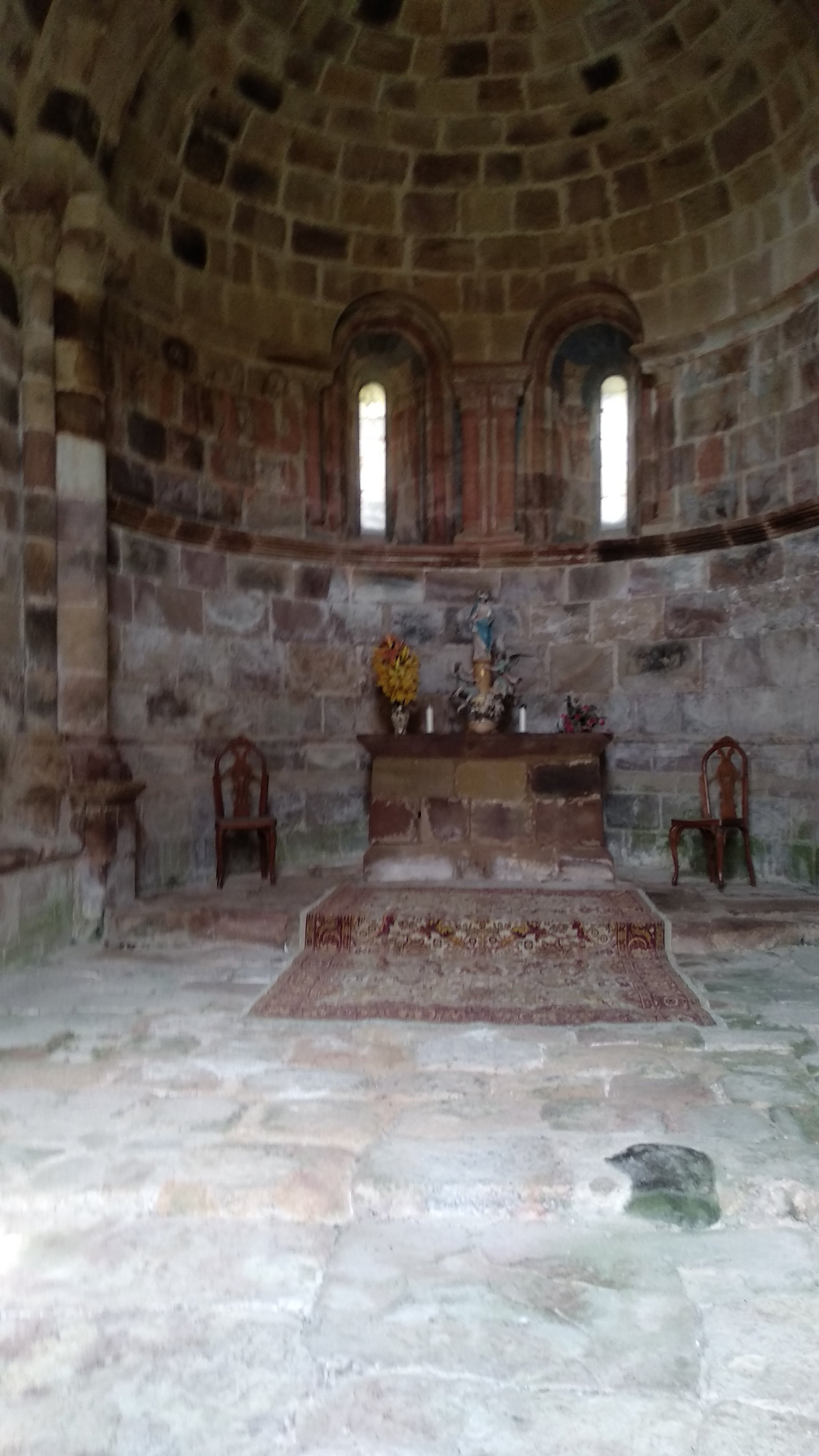 Ya en el interior tiene forma redonda y se cubre con una bóveda de horno en el ábside y bóveda de cañón apuntado en el presbiterio, un arco fajón separa ambas cubiertas.