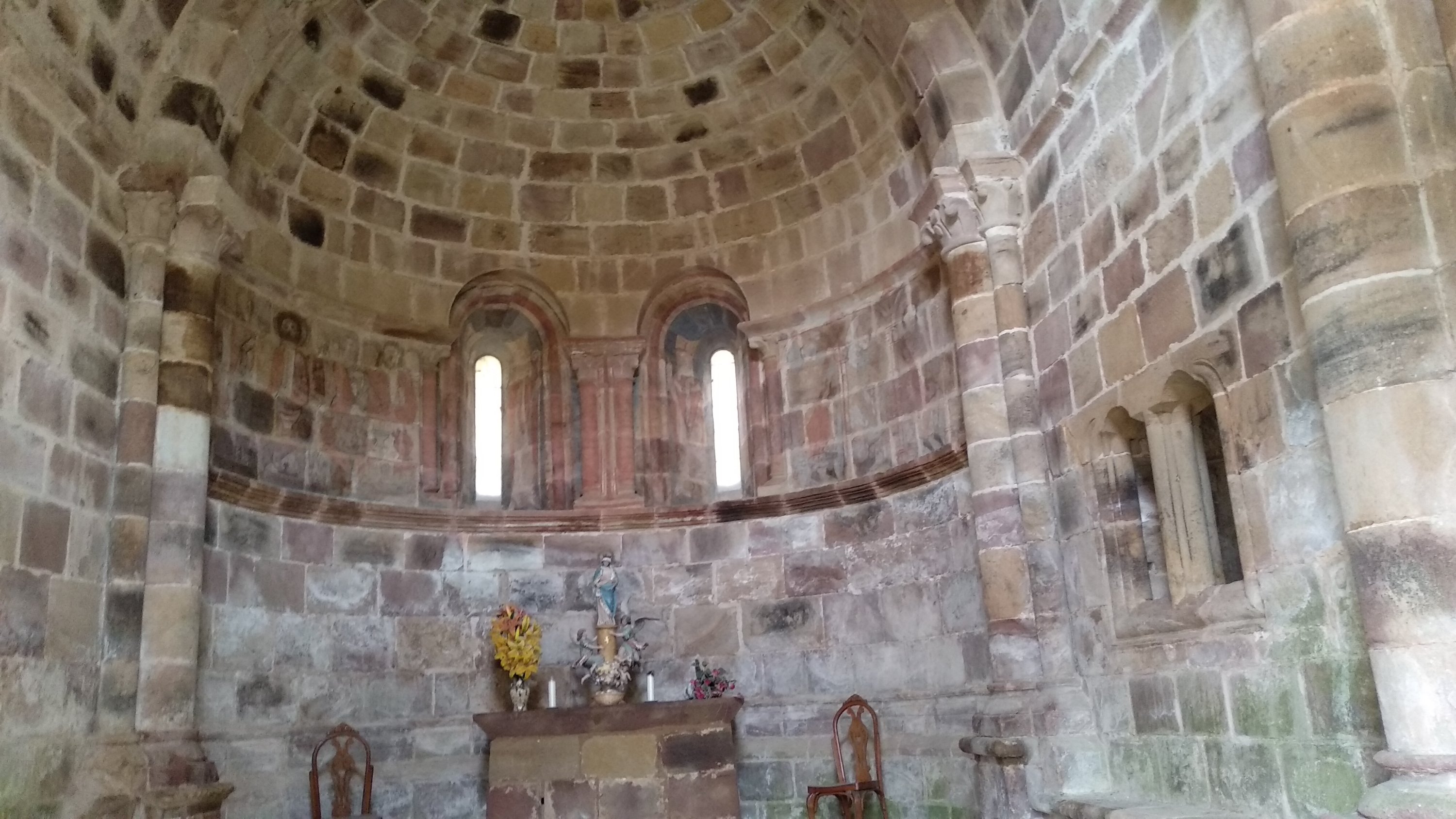 También destacar las pinturas que adornan el ábside pinturas al fresco realizadas al temple directamente sobre el muro, en el lado derecho la Epifanía y en el lado izquierdo la Santa Cena , en los derrames de las ventanas hay 4 abades benedictinos, los tonos utilizados son rojo, ocre, negro y gris.