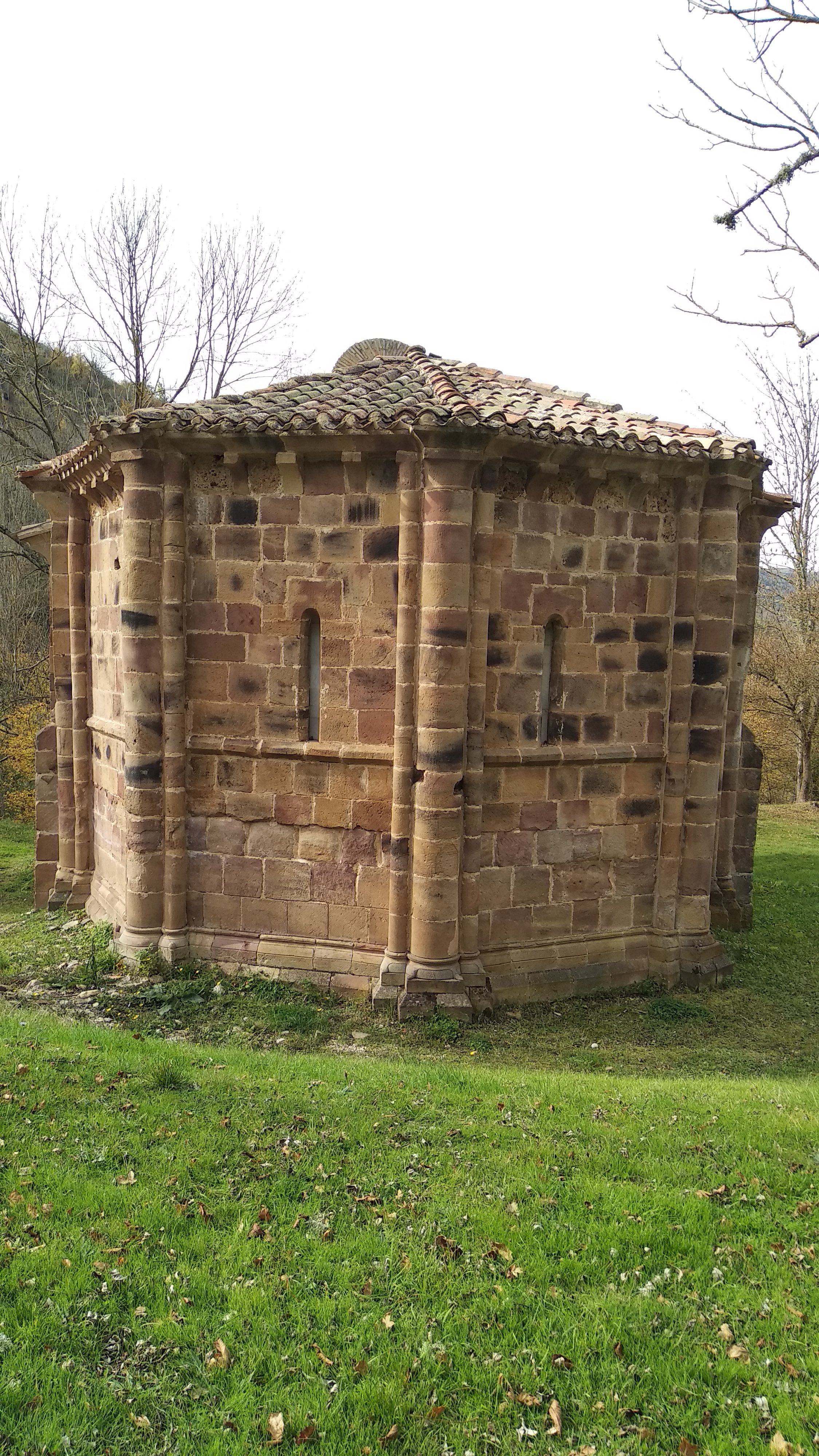 El Ábside por el exterior tiene forma poligonal, con tres columnas adosadas, los capiteles y canecillos son sencillos y lisos sin decoración, las dos ventanas que están en el tramo central tienen derrame hacia el interior.