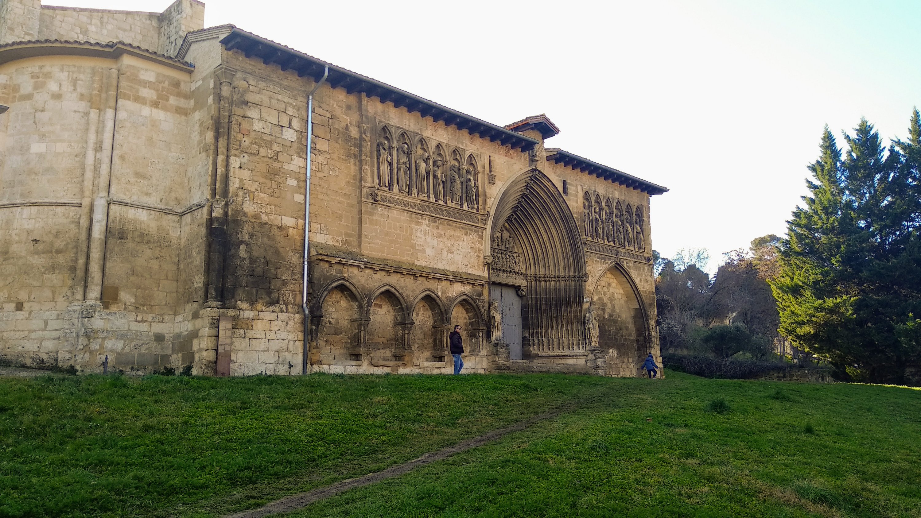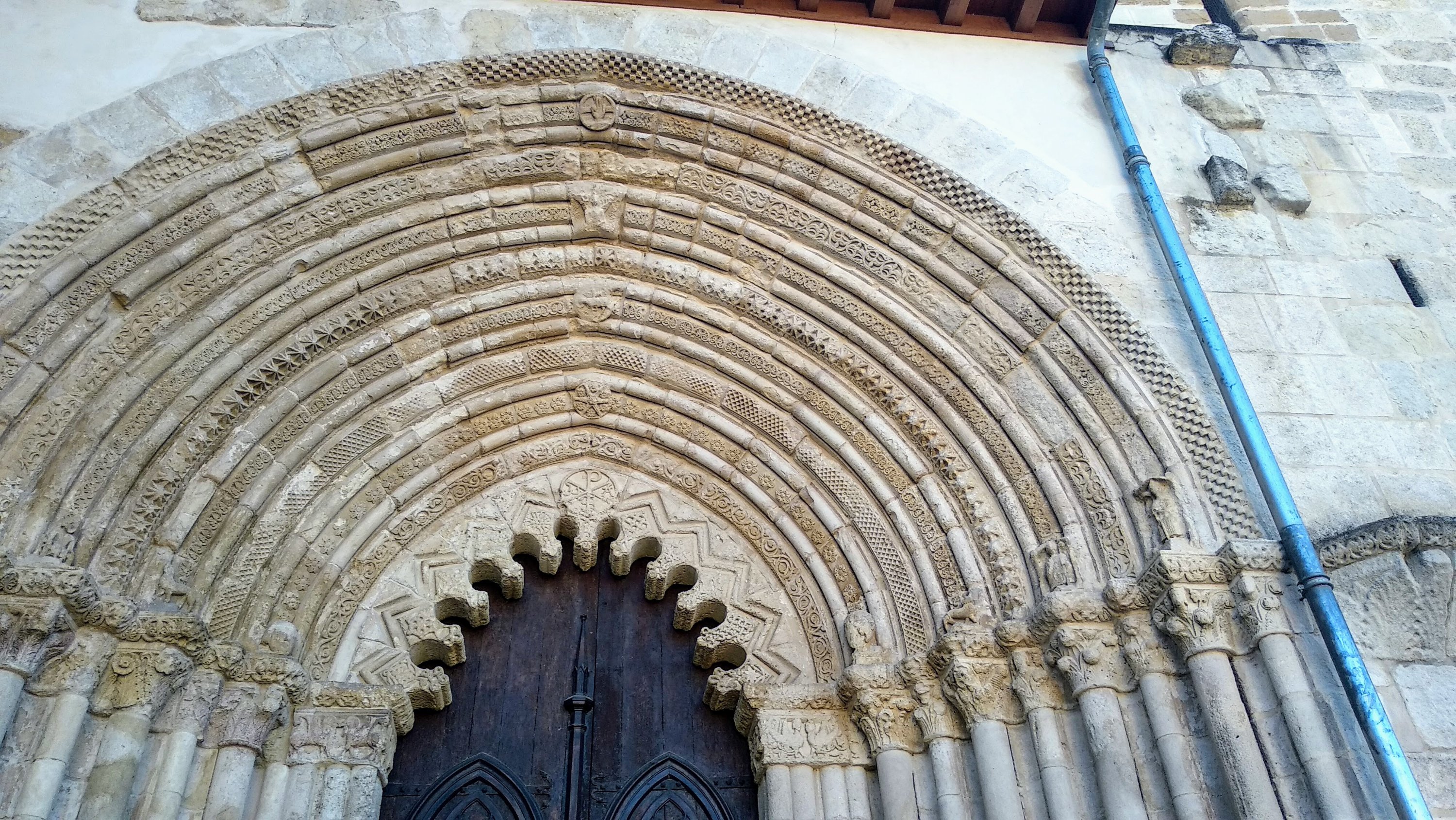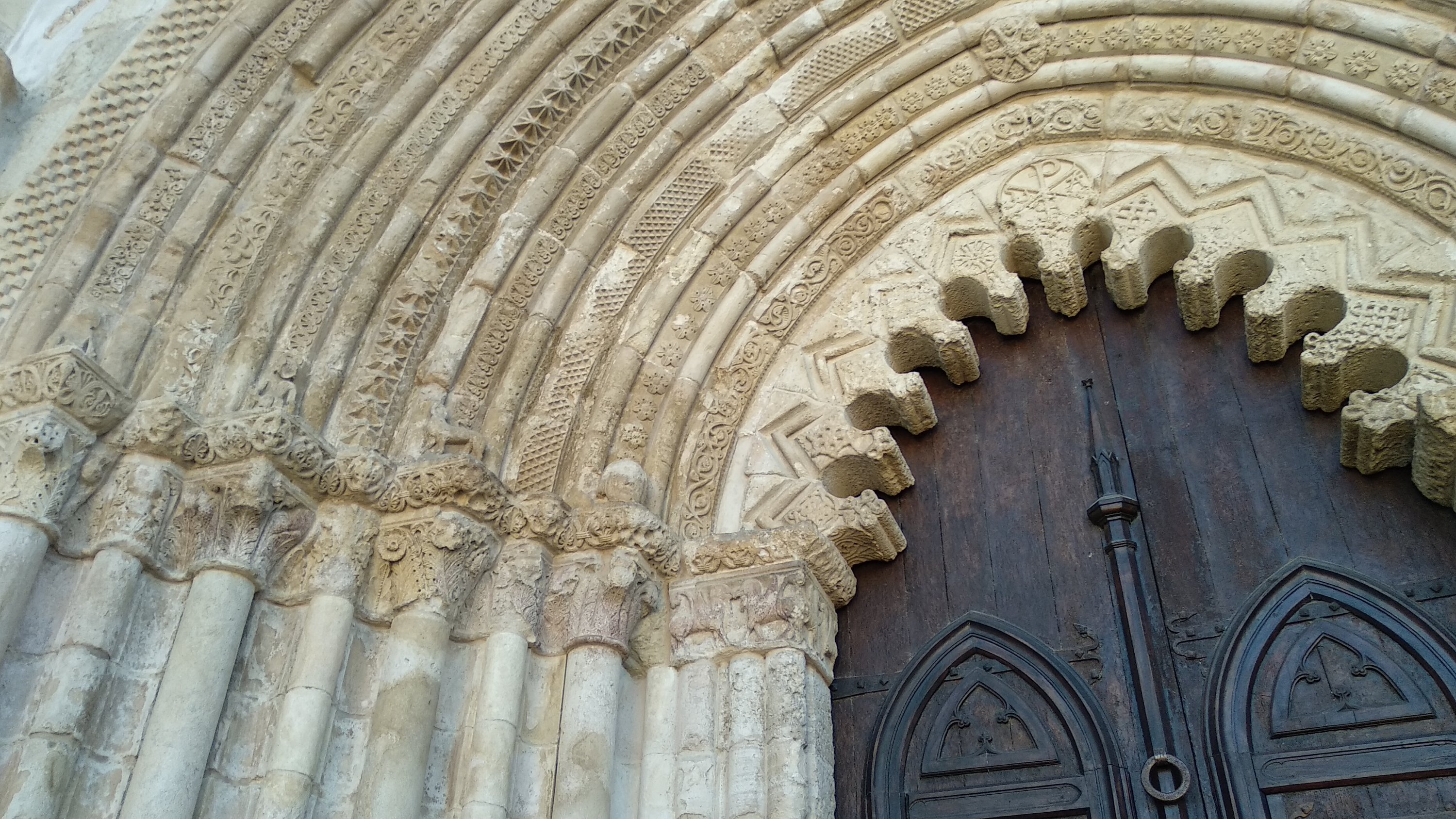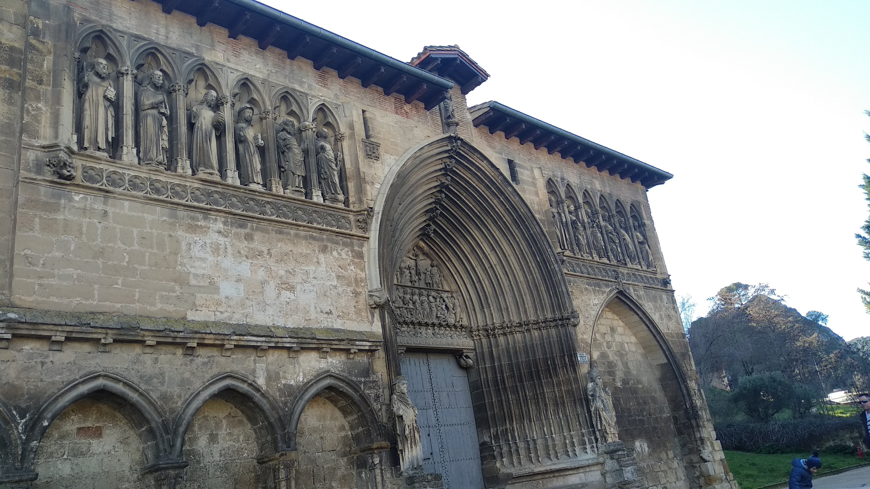 Nuestra excursión comenzó visitando la Iglesia del santo sepulcro, cerca hay un aparcamiento y fue allí donde dejamos el coche, esta iglesia comenzada a finales del siglo XII y que se termino en el siglo XIV, en su portada si vemos las claves de las arquivoltas vemos ángeles portando los elemento de la pasión y coronando estas hay una talla de Cristo resucitado. Además de una escena de la Crucifixión, la Resurrección y el descenso de Cristo a los infiernos y la última cena.