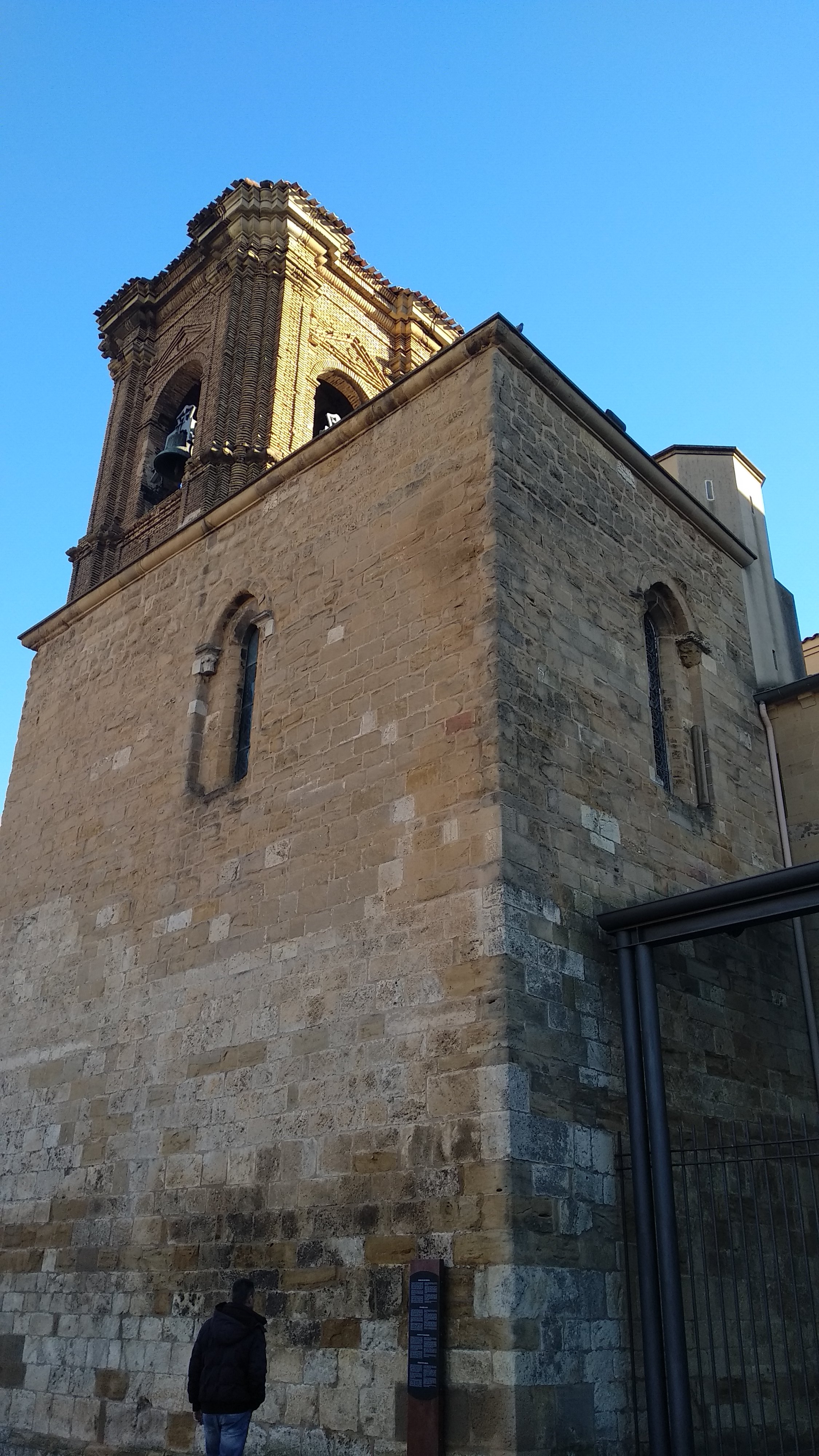 Un poco más arriba Santa María Jus del Castillo se alza sobre el solar en el que estuvo emplazada la sinagoga Judía que fue cedida por el rey García el Restaurador a la Catedral de Pamplona en 1145, con una sola nave, en su exterior románica con galería de canecillos de decoración vegetal, a los pies una fachada barroca, añadida en la segunda mitad del siglo XVIII igual que la torre de ladrillo.