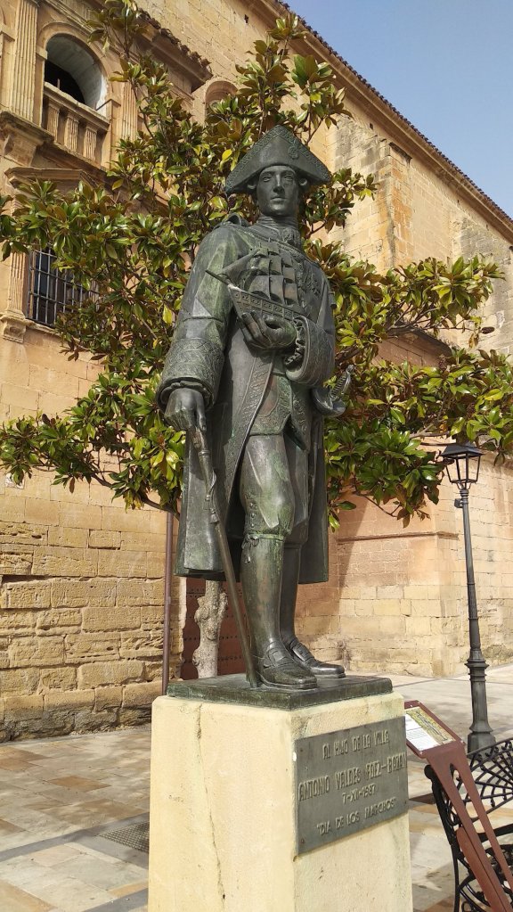 Justo donde la Iglesia tenemos la estatua en conmemoración a Don Antonio Valdés y Fernández Bazán, que fue ministro de Marina de Carlos III y Capitán de la Armada Española, fue el creador de la actual bandera Española.
